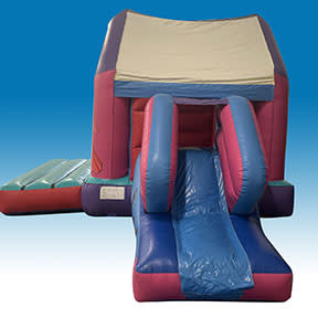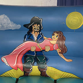 The Pirate & Princess Combo Castle is suitable for indoor or outdoor use with rain cover included.