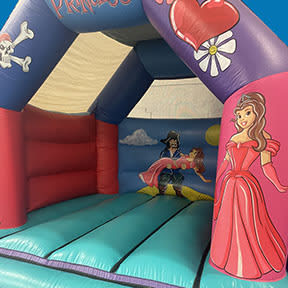 The Pirate & Princess Combo Castle is suitable for indoor or outdoor use with rain cover included.