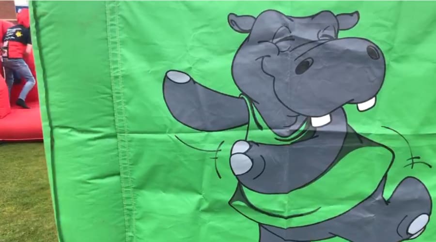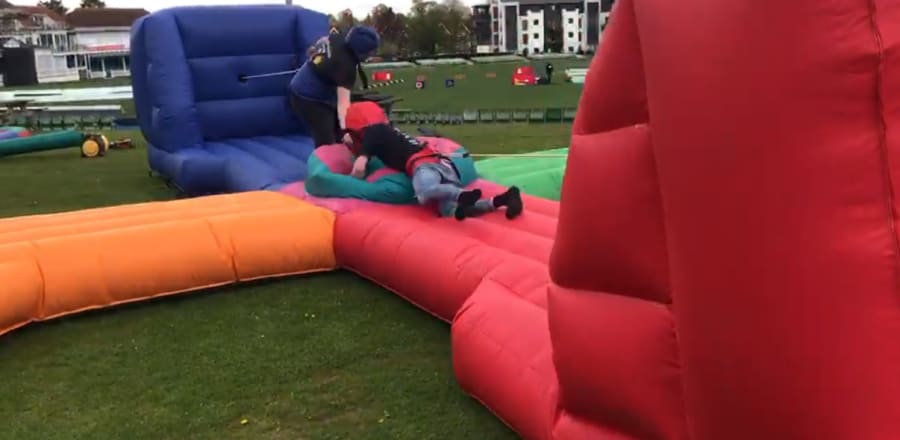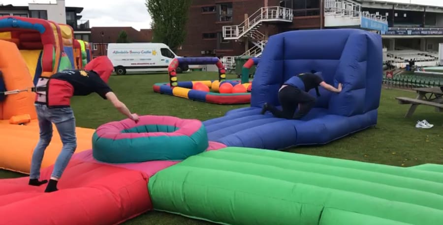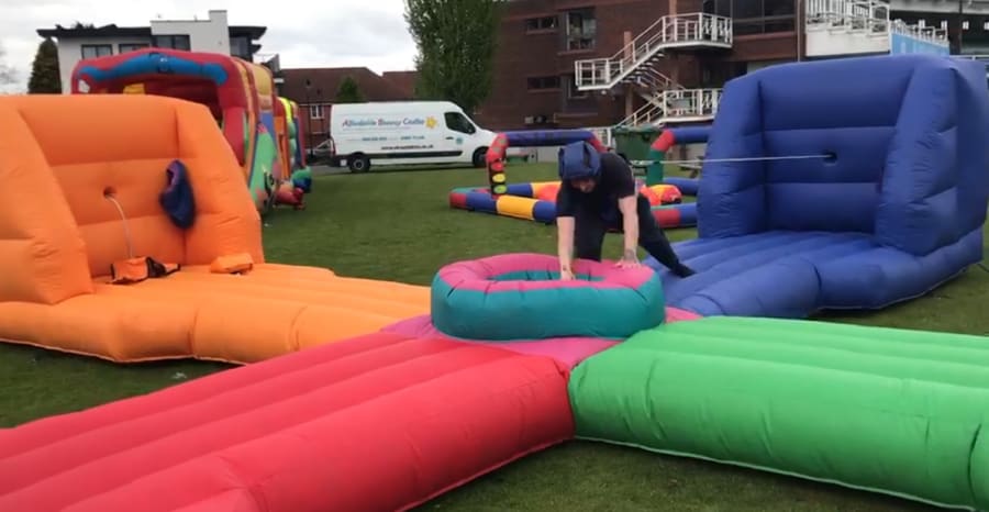 Four contestants are attached by bungee cords to a wall and have to compete to grab balls from the middle section and put in the bag attached to the wall, great fun for all the family.
