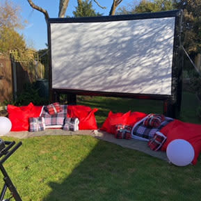 Our outdoor cinema screen can only be enjoyed after sunset. Includes large inflatable cinema, bean beds & cushions, projector and speaker.